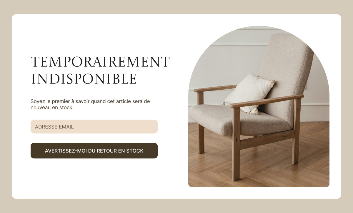 Un formulaire de retour en stock sur une page produit en rupture transforme une vente manquée en file d’attente de clients prêts à acheter lorsque le stock sera de nouveau disponible.